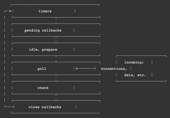 이벤트 루프는 라운드 로빈(round-robin) 방식으로 노드 프로세스가 종료될때까지 일정 규칙에 따라 여러개의 페이즈들을 계속 순회한다. 페이즈들은 각각의 큐들을 관리하고, 해당 큐들은 FIFO(First In First Out) 순서로 콜백함수들을 처리한다.