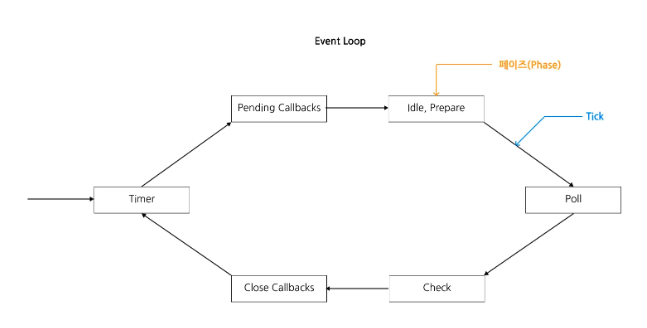- 각 페이즈를 돌면서 이벤트 루프가 실행가능한 상태인지 확인하고 실행하고, 해당 이벤트 루프가 새로운 콜백을 만들어내면 새로운 콜백을 해당하는 페이즈에 집어넣는다.