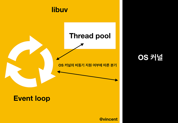 - 만약 커널이 지원하는 비동기 작업을 libuv에게 요청하면 libuv는 대신 커널에게 이 작업을 비동기적으로 요청해준다.