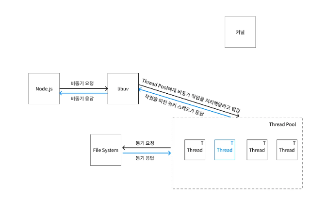 - 만약 커널이 지원하지 않는 비동기 작업을 libuv에게 요청하면 livuv는 내부에 가지고있는 스레드 풀에게 이 작업을 요청해준다.