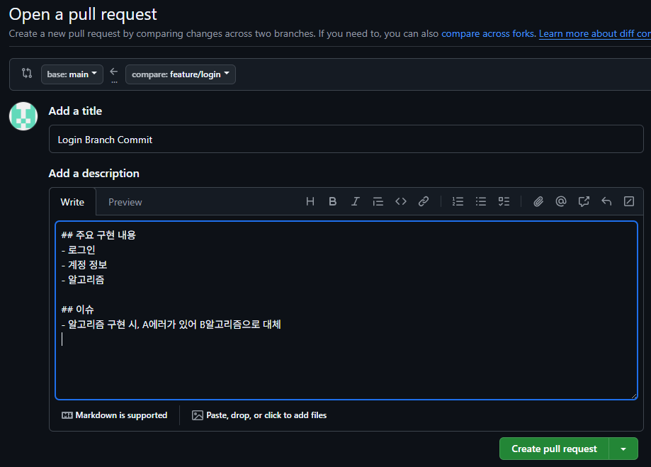 - Pull Request : 추가 브랜치 -> main 브랜치 병합 시켜줘