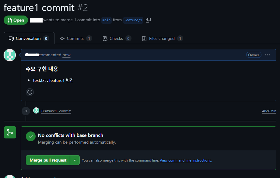 - test.txt 변경 : feature1