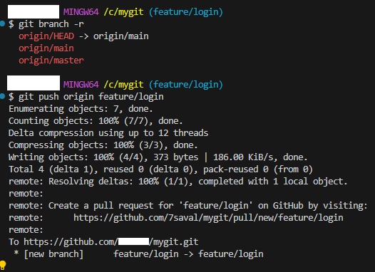 - git push 깃허브저장소별칭 깃브랜치명 : git push origin feature/login