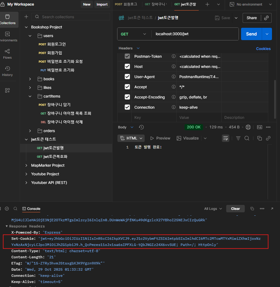 - 지난 쿠키값 그대로 받아 다음 api 실행 시 req.cookie에 그대로 씀