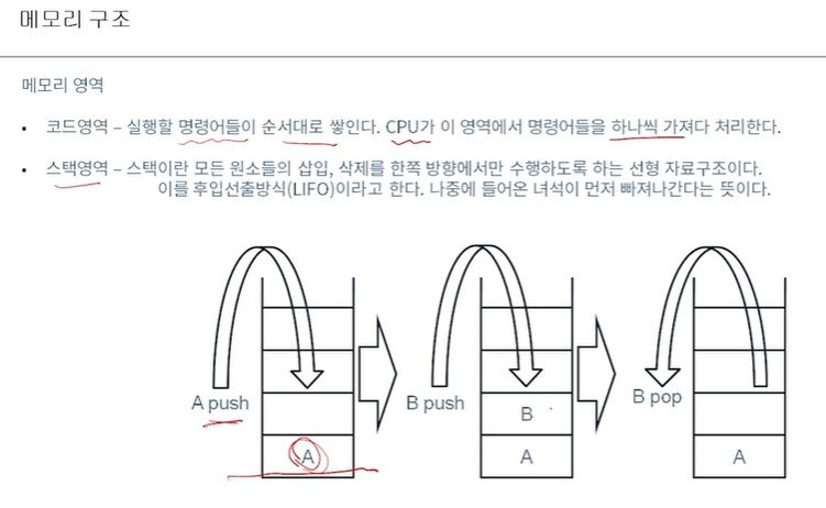 - 힙영역(큐 메모리) : 힙은 컴퓨터 메모리의 일부가 할당되었다가 회수되는 일들의 반복문