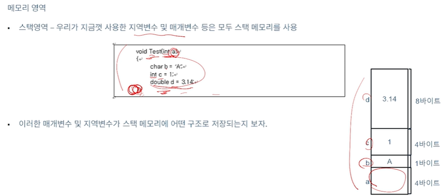 - 스택 영역 : 우리가 지금껏 사용한 지역변수 및 매개변수 등은 모두 스택 메모리 사용