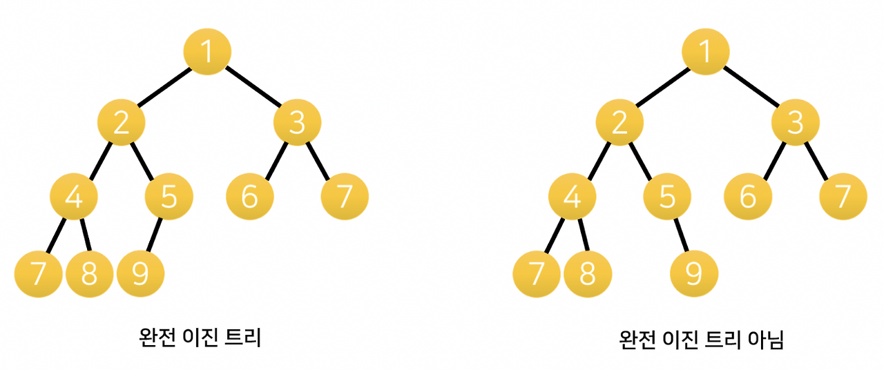 | 완전 이진 트리 | 마지막 레벨을 제외한 모든 레벨이 꽉 차 있음 |